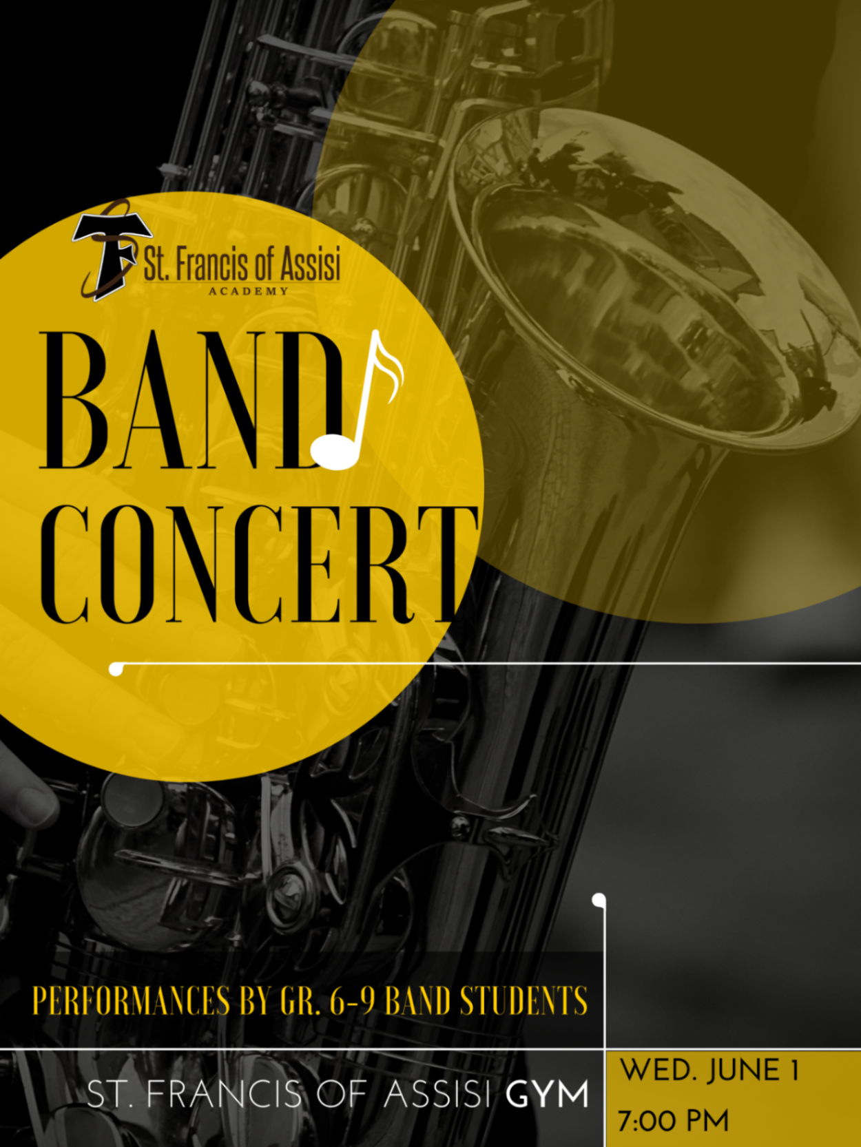 Our Gr. 6-9 Band Concert is taking place next Wednesday, June 1st beginning at 7 pm in the school gym. All student performers are asked to arrive at 6:30 pm in their all-black band uniform.
